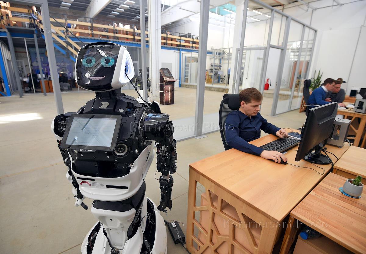 Рабочая поездка председателя правительства Дмитрия Медведева в Пермь. Сотрудники компании Promobot…