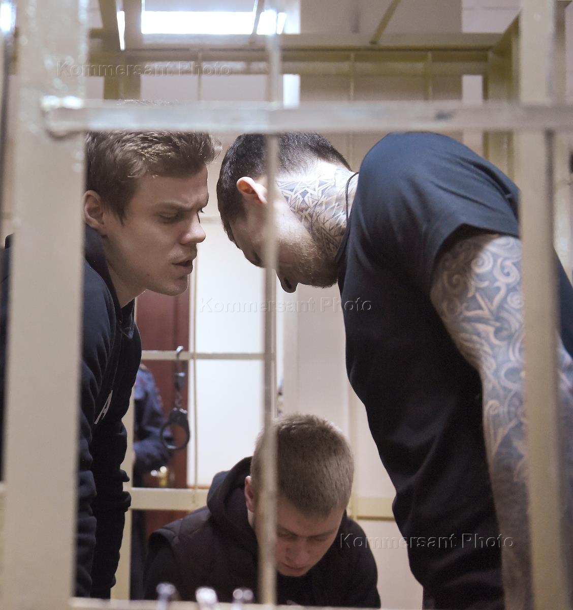 Футболисты Павел Мамаев (слева) и Александр Кокорин (в центре), обвиняемые в хулиганстве и побоях,…