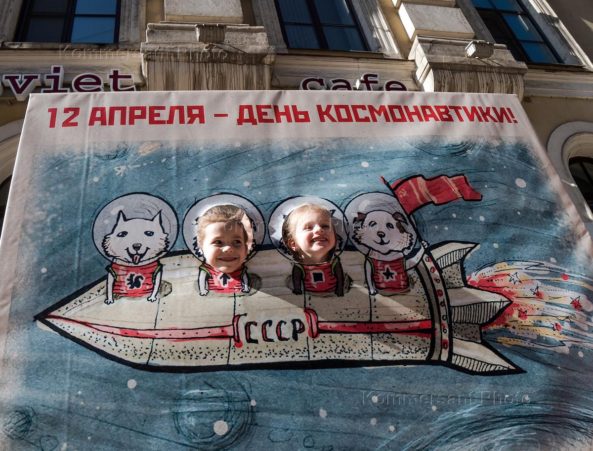 Жанровая фотография. Плакат с надписью "12 - апреля день космонавтики" на Малой Садовой улице.