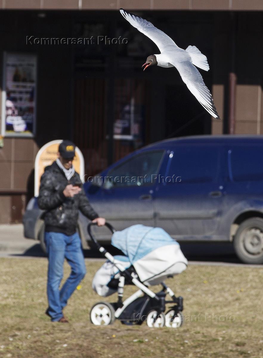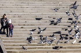 Виды Санкт-Петербурга. Голуби на набережной. Женщина с ребенком кормят птиц.