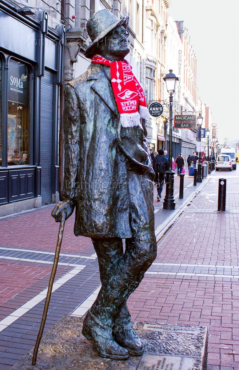 Виды Дублина. Шарф с атрибутикой футбольной команды "Спартак" на памятнике писателю Джеймсу Джойсу.