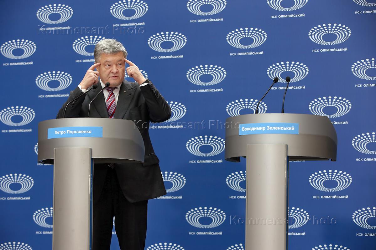 Политика Предвыборная кампания кандидата на должность президента Украины Петра Порошенко. Несостоявшиеся дебаты кандидатов на должность президента Украины Петра Порошенко и Владимира Зеленского. Кандидат на должность президента Украины, действующий президент Украины Петр Порошенко во время выступления на стадионе в Национальном спортивном комплексе "Олимпийский".