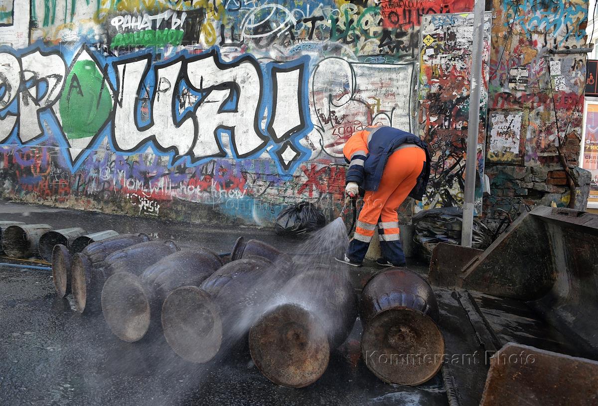 Стена памяти Виктора Цоя на улице Арбат закрашена фанатами футбольного клуба "Динамо"