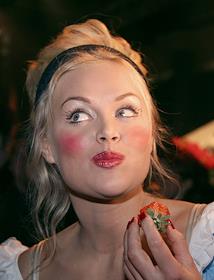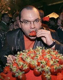 Российский экономический форум в Лондоне. Участница пати "Moscow - Motion" ест клубнику.