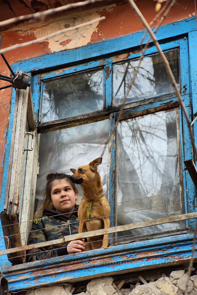Быт жителей аварийных домов в Барнауле. Девочка с собакой в окне дома.