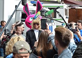 Стилист Сергей Зверев (в центре) перед началом заседания Тверского районного суда.