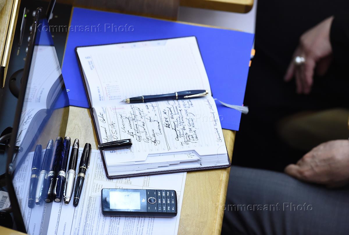 Пленарное заседание Государственной думы (ГД) России. Жанровая фотография. Рабочее место депутата ГД…