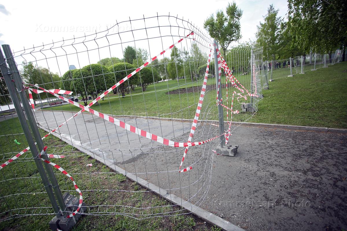 Забор вокруг стройки храма в сквере у театра Драмы.