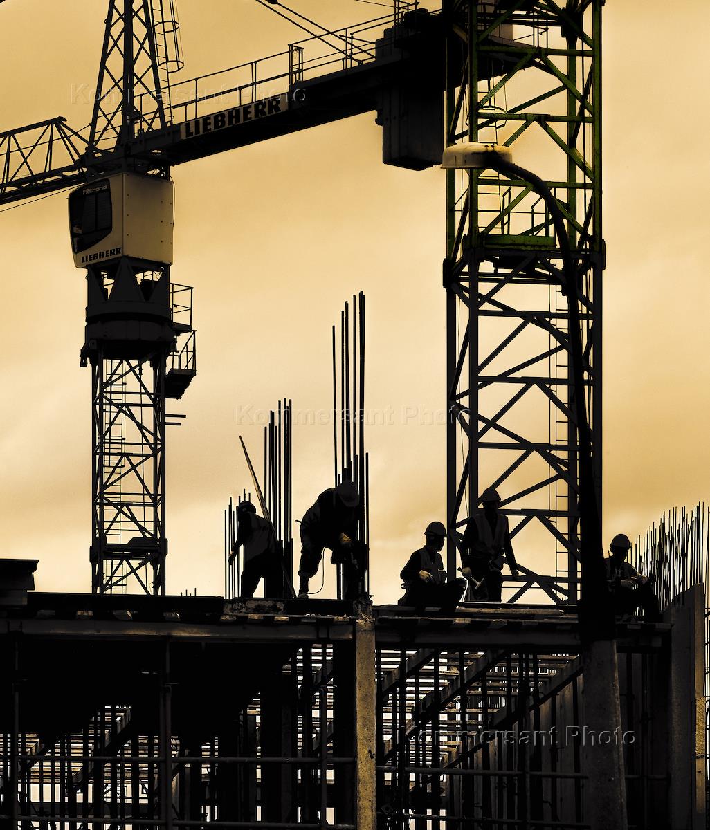 Жанровая фотография. Строительная площадка. Рабочие во время вязки арматуры под заливку бетона.