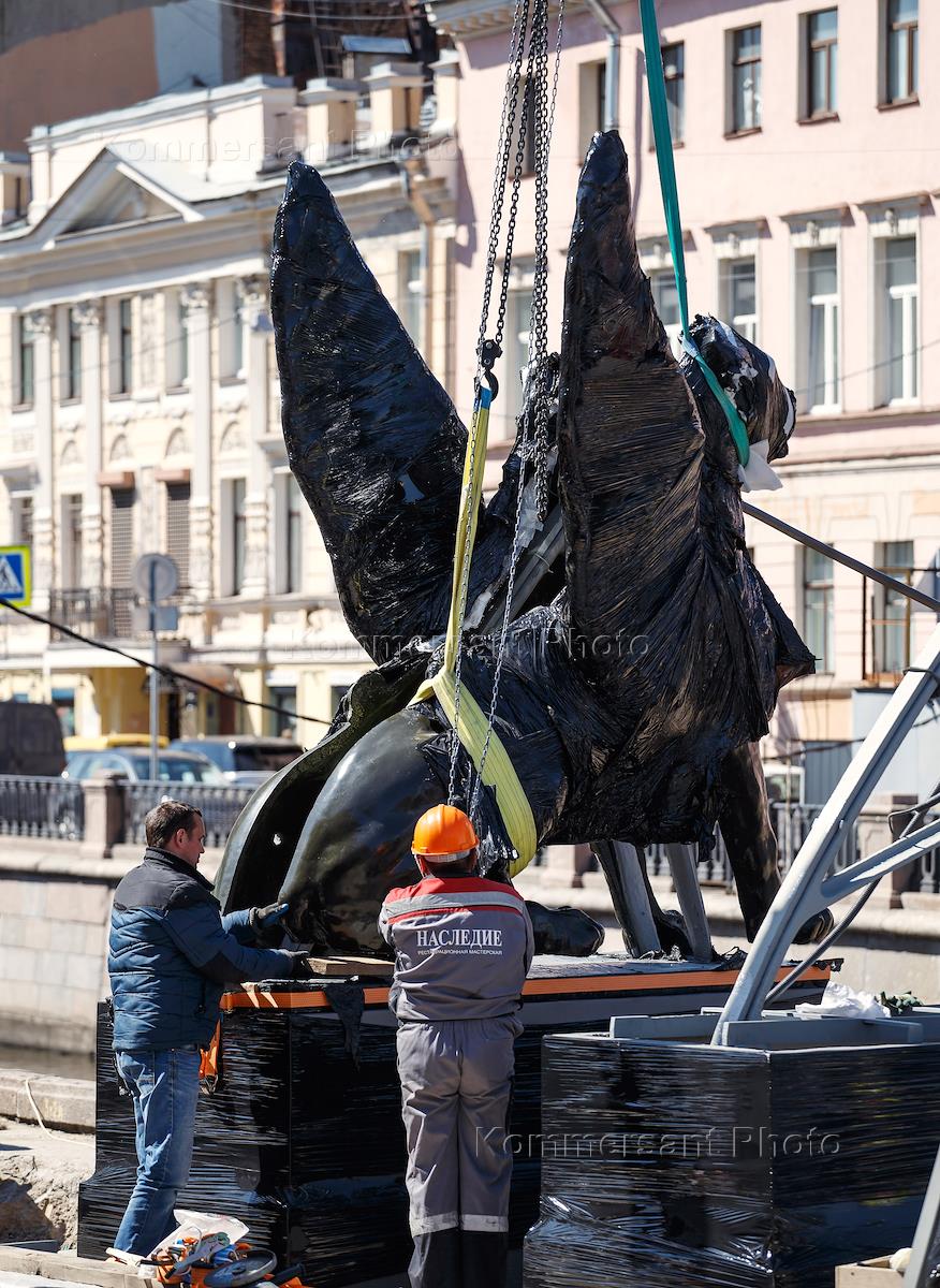 Установка скульптур грифонов на Банковском мосту после реставрации.