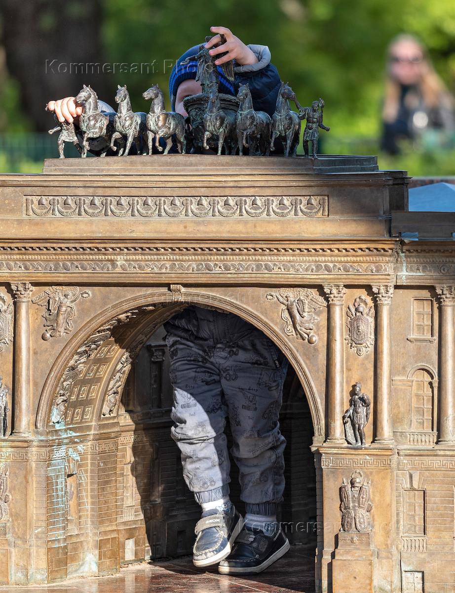 Жанровая фотография. Дети играют с макетом арки Главного штаба.