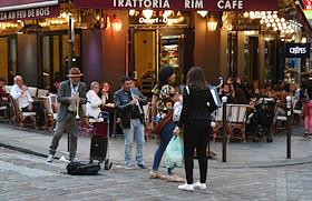 Виды Парижа. Жанровая фотография. Музыканты выступают на улице перед рестораном.