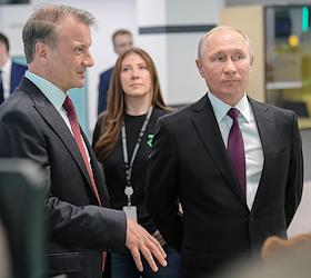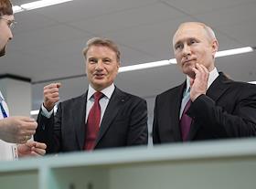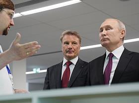 Президент России Владимир Путин (в центре) и председатель правления Сбербанка России Герман Греф…