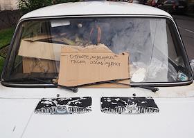 Жанровая фотография. Объявление на куске картона на лобовом стекле легкового автомобиля.