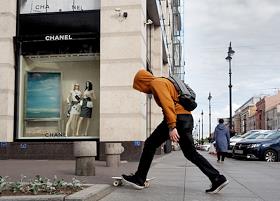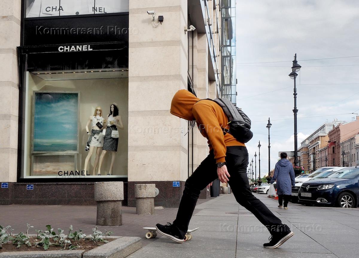 Жанровая фотография. Молодой человек со скейтбордом возле бутика Chanel.