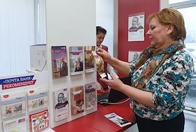 Жанровая фотография. Сотрудники "Почта Банк" у стенда с рекламной продукцией банка.