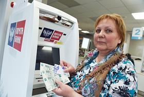 Пенсионерка Лариса Прохорова в отделении "Почта Банк" получает пенсию.