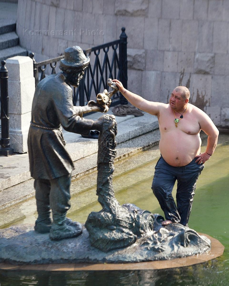 Жанровая фотография. Жара в Москве. Мужчина у фонтана "Золотая рыбка" на Манежной площади.