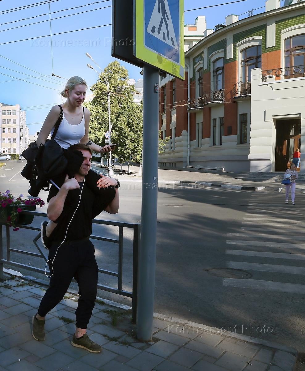 Жанровая фотография. Молодой человек несет на плечах девушку.