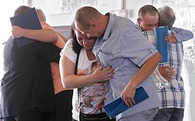 Украинские военнопленные, переданные властями ДНР и ЛНР официальному Киеву: Дмитрий Великий, Яков Веремейчик, Максим Горяинов и Эдуард Михеев прилетели самолетом из Минска в аэропорт "Жуляны".
