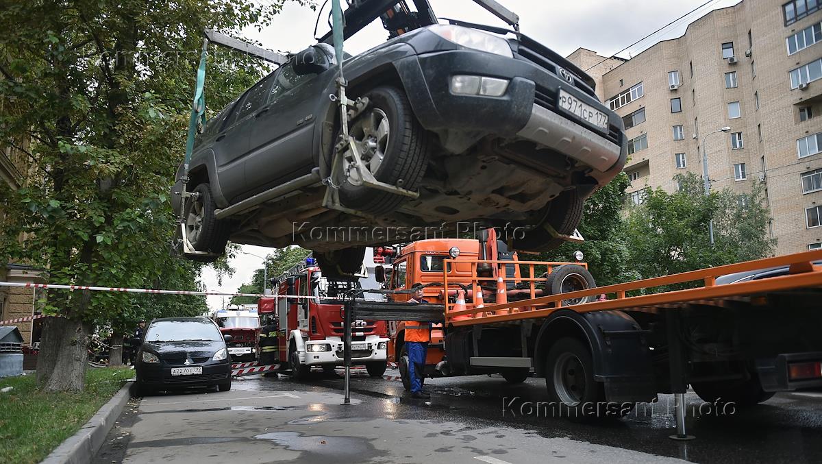 Сотрудники коммунальных служб во время эвакуации автомобиля рядом с местом пожара в пятиэтажном…