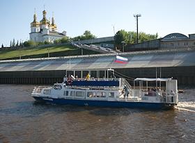 Виды Тюмени. Храм во имя Святых апостолов Петра и Павла и теплоход на реке Тура.