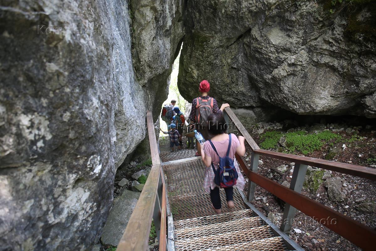 Природный парк "Оленьи ручьи". Деревянные дорожки у горы.
