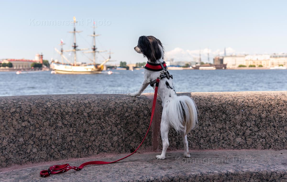 Жанровая фотография. Репетиция парада в честь Дня Военно-морского флота (ВМФ). Собака породы…