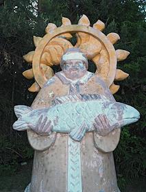 Виды Ханты-Мансийска. Скульптура мифического персонажа - рыбак Хант с рыбой на фоне солнца.