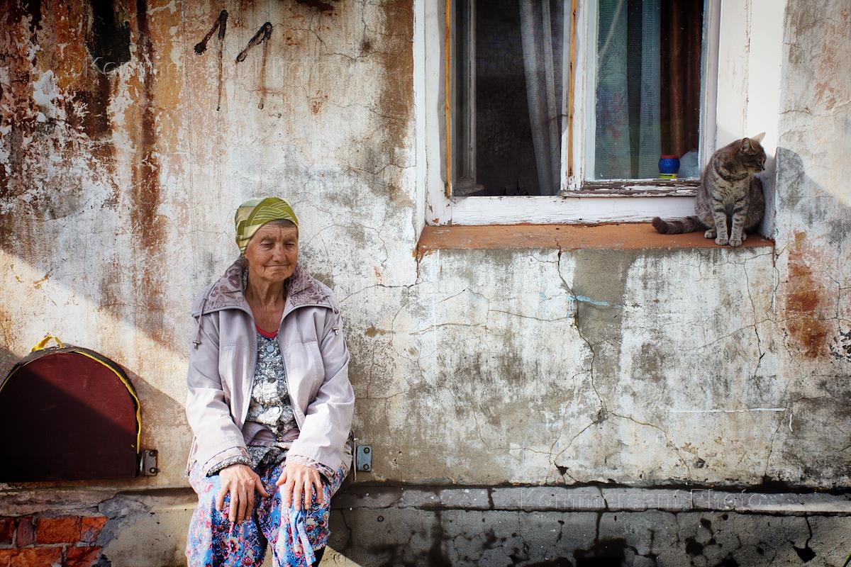Жанровая фотография. Пожилая женщина сидит у старого дома.