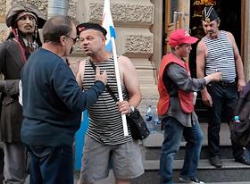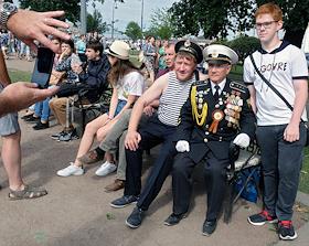 Празднование Дня Военно-морского флота (ВМФ) России в Санкт-Петербурге. Бывшие моряки на улице…