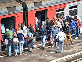Жанровая фотография. Пассажиры на платформе станции Лосиноостровская во время посадки в электричку.