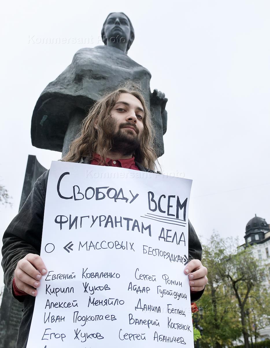 Участник одиночого пикета в поддержку задержанных по делу о массовых беспорядках в центре Москвы 27…