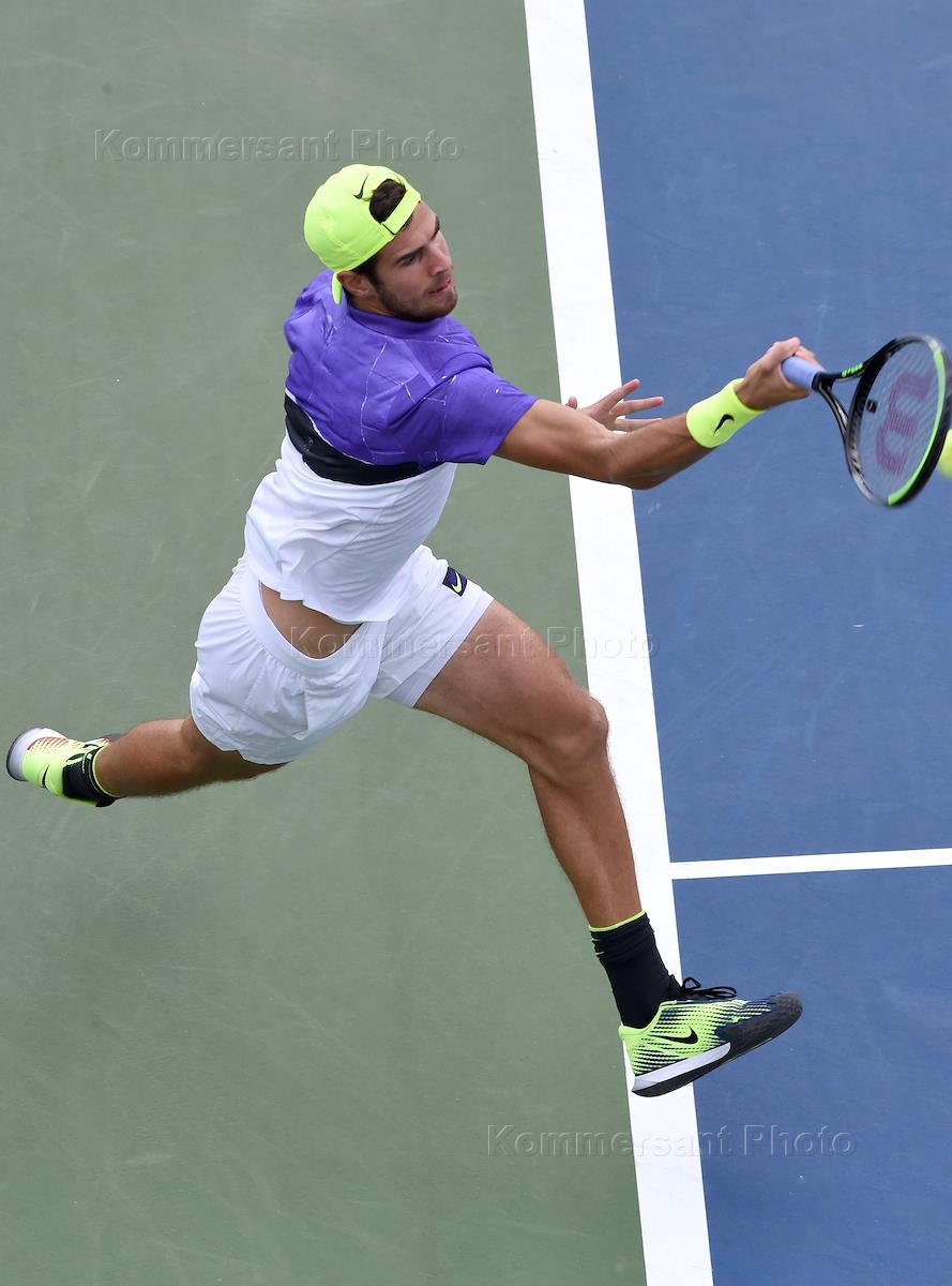 Открытый чемпионат США (US Open) по теннису. Российский теннисист Карен Хачанов во время матча с…