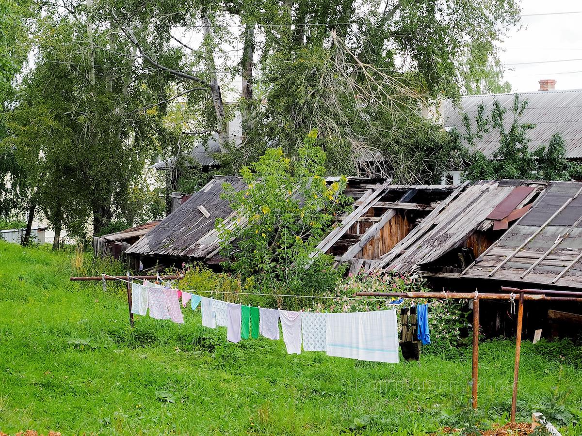 Виды Дегтярска. Жанровая фотография. Белье сушится около разрушающегося деревянного дома.