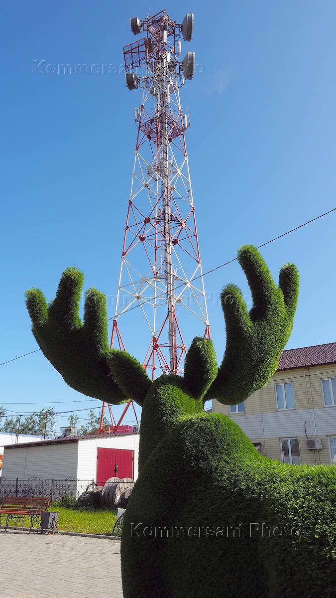 Жанровая фотография. Детская площадка. Топиарная фикура оленя на фоне вышки мобильной связи.