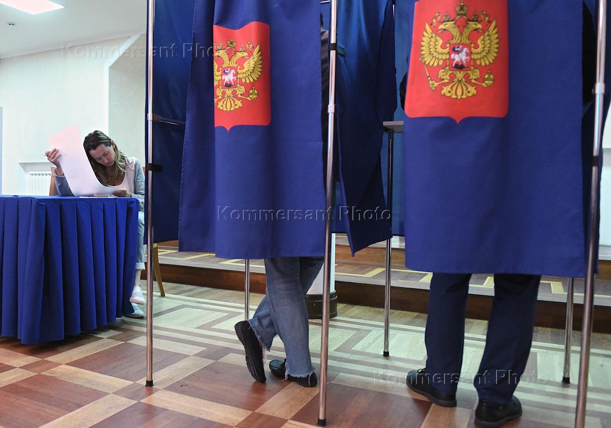 Единый день голосования. Избиратели в кабинах для голосования на избирательном участке.