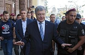 Бывший президент Украины Петр Порошенко (в центре) перед началом допроса в Государственное бюро…