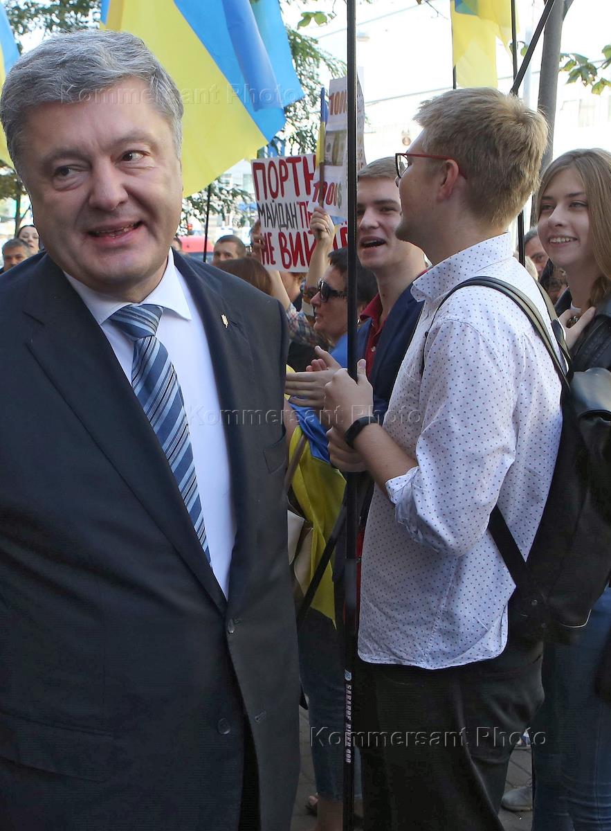 Бывший президент Украины Петр Порошенко (слева) перед началом допроса в Государственное бюро…