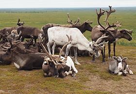 Приуральский район. Стойбище оленеводов хантов в тунде. Олени крупным планом.