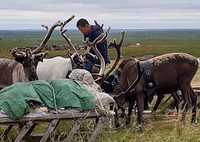 Олени и оленеводы-ханты в ямальской тундре.