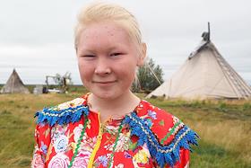Стойбище оленеводов-хантов в тундре. Девочка-подросток в национальном платье в стойбище.