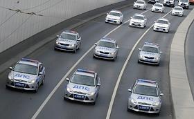 Парад и выставка городской техники на проспекте Сахарова. Колонна автомобилей дорожно-патрульной…