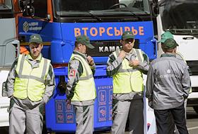 Парад и выставка городской техники на проспекте Сахарова. Автомобили по сбору вторсырья на выставке.