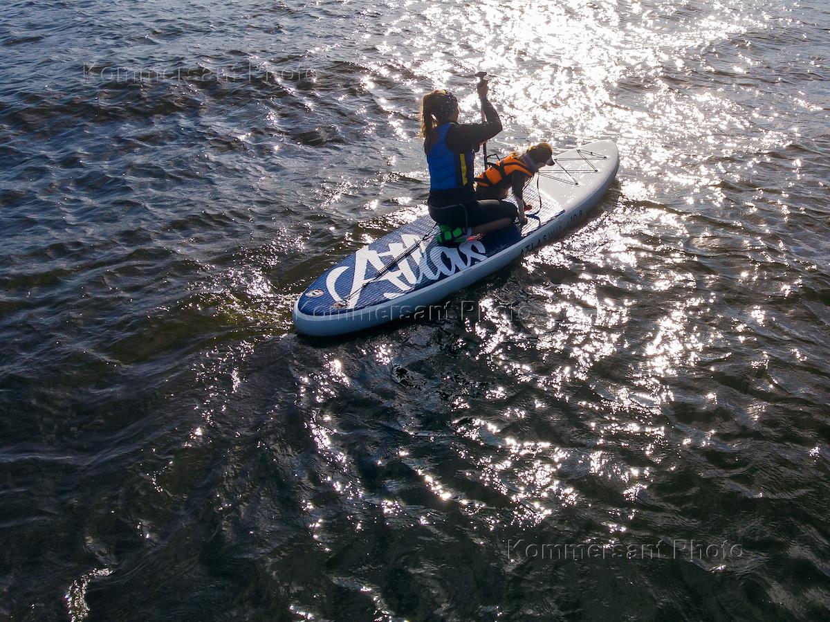 Petshop Sup - заплыв на сап-серфах с собаками в гавани торгово-развлекательного центра "Питерлэнд" в Санкт-Петербурге.