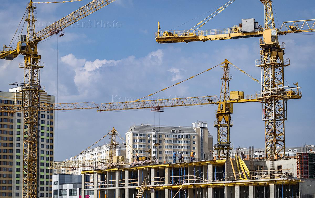 Жанровая фотография. Подъемные краны на строительной площадке во время строительства жилого дома.