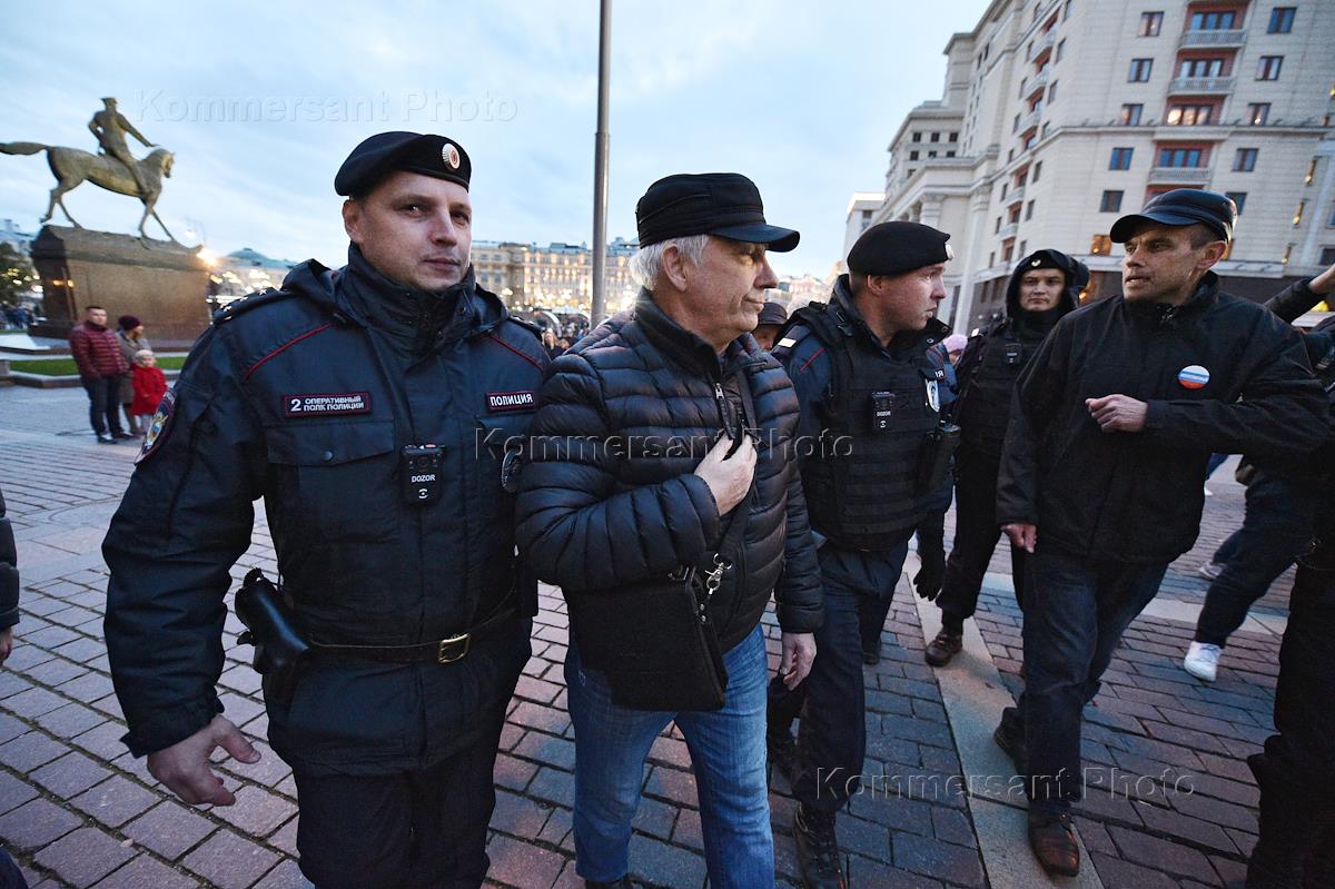 Общество Одиночные пикеты в поддержку Константина Котова, обвиняемого в неоднократном нарушение правил проведения митинга. Участники пикета у памятника маршалу Георгию Жукову на Манежной площади.
