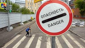 Виды Санкт-Петербурга. Жанровая фотография. Мальчик на самокате переезжает улицу по пешеходному…