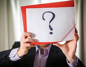 Жанровая фотография. Мужчина в костюме держит в руках лист со знаком вопроса, закрывая им лицо.