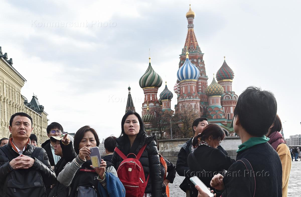 Виды Москвы. Жанровая фотография. Туристы из Китая во время экскурсии на Красной площади.